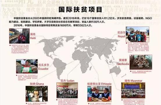 從2005年援助印尼海嘯開始,截至2016年底,中國扶貧基金會已在17個國家或地區(qū)總投入約1.12億元,涉及緊急救援、設(shè)備援助、NGO能力建設(shè)、醫(yī)院建設(shè)、學(xué)校供餐、大學(xué)生資助及社區(qū)綜合發(fā)展等項目,受益人數(shù)約30萬人次。2016年,我會國際項目籌集資金1699萬元,幫助55623人次。