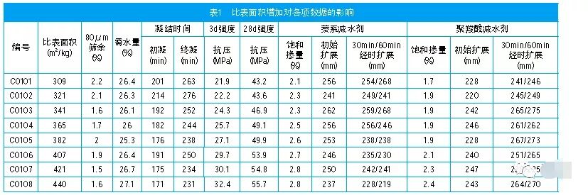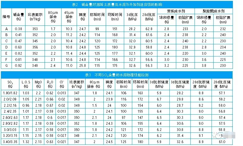 在水泥熟料礦物當(dāng)中,C3A的水化速度是最快的,它在水化作用時,能離解出Al3+,使水化物形成的膠體溶液發(fā)生凝聚。當(dāng)加入石膏以后,可以和C3A很快化合,生成硫鋁酸鈣晶體,使凝結(jié)時間延緩。在石膏摻量過高時,C3A電離出的Al3+雖然很快消失,但是硫酸鈣電離出來的Ca2+又起凝結(jié)作用,同樣產(chǎn)生促凝作用,生成硫鋁酸鈣,產(chǎn)生體積膨脹,會使已硬化的水泥石強度降低,甚至使構(gòu)件開裂。因此,在粉磨水泥時要控制石膏的摻加量。從表3可知,水泥中SO3含量從1.8%~2.8%范圍內(nèi),凝結(jié)時間未體現(xiàn)規(guī)律性變化,在3.0%~3.4%,凝結(jié)時間有一定延長,但總體幅度不大,約10min~20min。隨著SO3含量的增加,3d及28d強度總體略呈增加趨勢,但幅度較小。從混凝土適應(yīng)性試驗分析中得出:使用萘系減水劑時,隨著SO3含量的不斷增加,減水劑的飽和摻量變化不明顯,初始擴展度變化不大,經(jīng)時損失率總體變小。使用聚羧酸系減水劑時,隨著SO3含量的不斷增加,減水劑的飽和摻量整體呈現(xiàn)下降趨勢,在同一摻量下,凈漿呈現(xiàn)初始擴展趨小變化,經(jīng)時均出現(xiàn)返大現(xiàn)象。綜合考慮水泥強度、凝結(jié)時間及水泥及減水劑的適應(yīng)性:水泥中SO3含量可控制在2.2%~2.8%之間。除上述水泥比表面積、R2O、SO3對混凝土質(zhì)量有直接影響外,其它品質(zhì)指標(biāo)對混凝土質(zhì)量也有影響:水泥需水量易引起混凝土強度變化,影響混凝土耐久性、和易性;水泥強度波動過大,則容易造成混凝土強度不合格;水泥粉磨工藝和顆粒分布等對混凝土質(zhì)量也有明顯影響。從混凝土使用角度,需進一步實驗和研究,控制好水泥質(zhì)量。