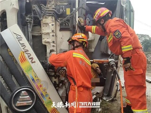 到達(dá)現(xiàn)場后,指揮員立即下車對現(xiàn)場情況進(jìn)行偵查,發(fā)現(xiàn)事故車輛是一臺(tái)裝滿了35噸混凝土的罐車,由于雨天路滑,司機(jī)行駛到一段下坡路時(shí)因操作不當(dāng)發(fā)生側(cè)翻。駕駛員被困在駕駛室內(nèi),駕駛室已嚴(yán)重變形,無法將車門正常開啟,現(xiàn)場醫(yī)護(hù)人員正為司機(jī)輸液補(bǔ)充能量。