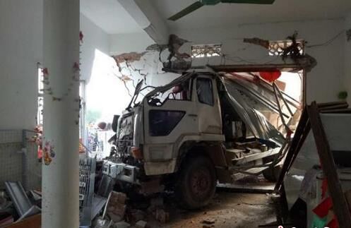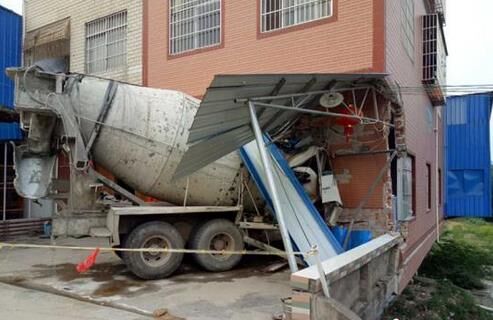 廣西欽州一輛大型混凝土攪拌車失控,一頭“扎”進路邊的居民樓,致被撞民房房體嚴重損壞,攪拌車上2人受傷。
