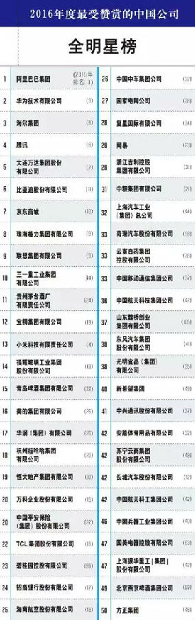 這份榜單一向被認(rèn)為是中國公司軟實(shí)力的晴雨表,今年的排行榜由《財(cái)富》(中文版)通過網(wǎng)絡(luò)向35000名中國企業(yè)管理人發(fā)放問卷調(diào)查得出。調(diào)查評分標(biāo)準(zhǔn)主要包括產(chǎn)品和服務(wù)地位、長期投資價(jià)值、公司資產(chǎn)合理利用、創(chuàng)新能力、管理質(zhì)量、財(cái)務(wù)穩(wěn)健程度、吸引和保留人才的能力、社會(huì)責(zé)任、全球化經(jīng)營的有效性9個(gè)方面,綜合得分最高的50家公司榮登“最受贊賞的中國公司”全明星榜。