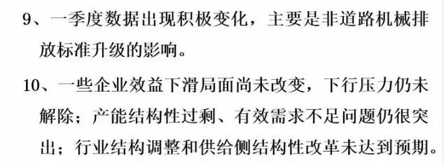 我個人總結,今年的運行情況有這樣十個方面。第一,從整個全行業(yè)各企業(yè)的資產(chǎn)規(guī)模上看,目前趨于穩(wěn)定,變化幅度很小,不像前兩年振動那么大。第二,從資產(chǎn)負債率來說,現(xiàn)在負債率是在60%左右,全國的工業(yè)企業(yè)是56%。所以,這個行業(yè)的資產(chǎn)負債率目前看也是很好的。這個需要引起大家的關注和分析,我們也希望后幾個月情況可以穩(wěn)定向好。還有自主品牌市場占有率,在國內(nèi)市場還是保持高位,從全行業(yè)來看在90%以上。那么,產(chǎn)業(yè)的集中度又進一步地增強了,但有一些企業(yè)挺無助的,出局了,進口額下降。今年按照環(huán)保部5號令,全行業(yè)工程機械產(chǎn)品實現(xiàn)了新的標準升級。整個產(chǎn)品進行了更新?lián)Q代,這個非常難能可貴。最后是產(chǎn)能結構性過剩,有效需求不足問題仍然突出,行業(yè)結構調整還有供給側結構改革遠遠沒有達到預期。即便是按照現(xiàn)在的挖掘機銷量5500多臺,就算是6000臺,產(chǎn)能又有多少?一旦市場回暖,一些企業(yè)家還是會頭腦一熱,這樣大一個產(chǎn)能釋放出來的產(chǎn)量是什么局面?我們必須保持一個清醒的頭腦。