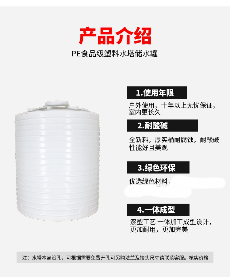 貴州1噸水箱、貴陽儲水箱、貴陽水塔用途:高層建筑二次供水、蓄水水處理凈化設(shè)備配套工業(yè)用冷卻水化工制劑、化工原料、各種油品、飲品的儲存、運輸。質(zhì)量保證:7天包換(非人為及不可抗拒的因素),1年免費維修。塑料平底儲罐:主材:進口韓國聚乙塑膠原料。 常用顏色:橙、藍、綠、黑等。性能:一次成型內(nèi)外光滑,具有良好的衛(wèi)生性與抗紫外線能力。撞擊,搞強震,不易老化,不長水藻,易清洗,安裝移動方便。應(yīng)用范圍:高層建筑二次供水,城鎮(zhèn),農(nóng)村屋頂蓄水,廣泛應(yīng)用于食品、制藥、賓館、酒店、電子、化工噴織等行業(yè)。 安裝說明及注意事項:1、每只水箱開進水、出水、排污三孔,有特殊要求另定。2、屋頂水箱應(yīng)放置在受力狀況良好的樓梯開間或平臺上。3、水箱為普力容器,故控制液位應(yīng)加裝浮球或其它有效控制裝置。
